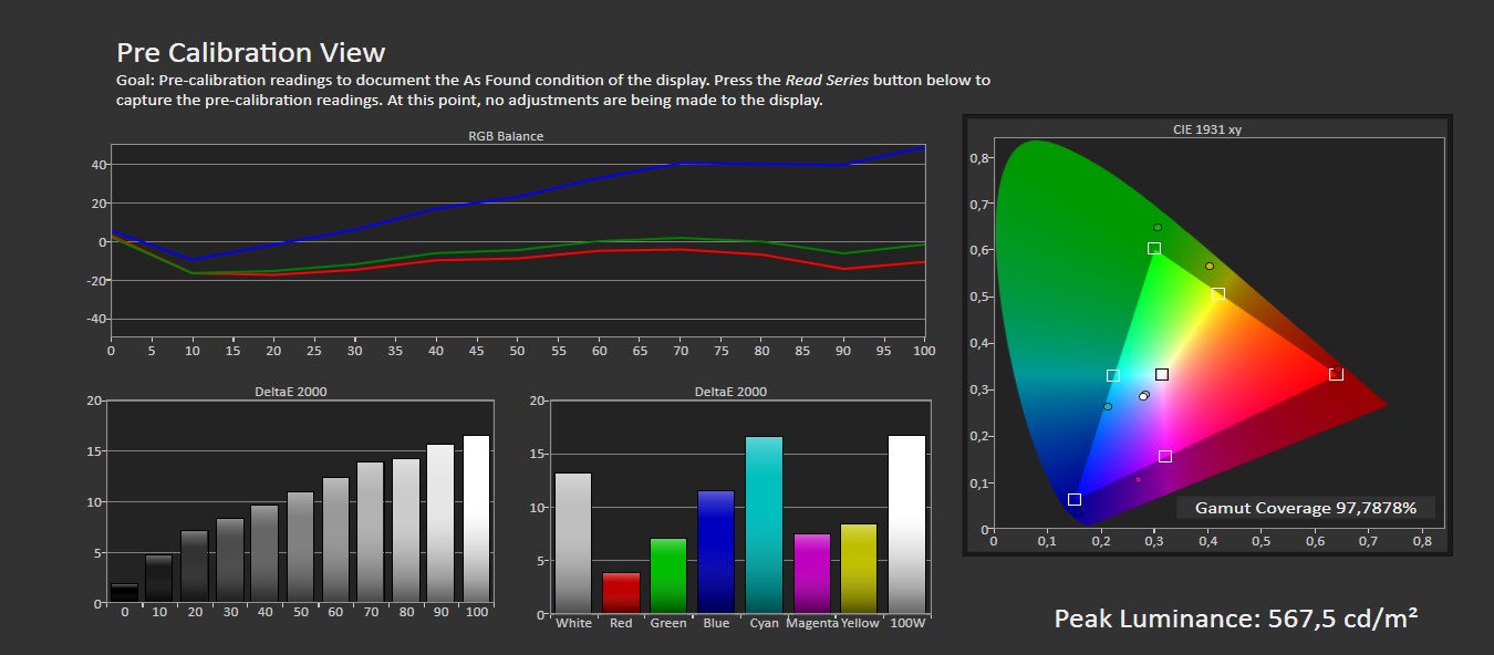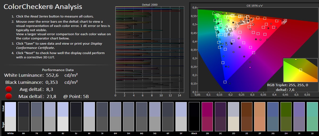 El contraste resulta ser correcto, en torno a 1.566:1, pero la fidelidad de colores no es especialmente buena con error medio de 8.3 dE (un valor por debajo de 4 dE se considera excelente y por encima de 9 se considera inaceptable) y un error máximo de 23.8 dE.