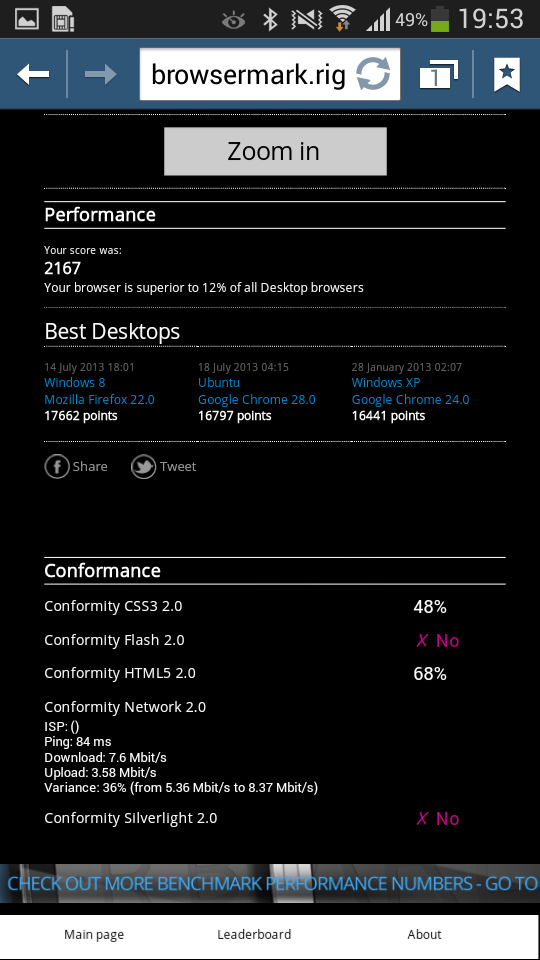 En las pruebas de navegadores, BrowserMark 2.0 ha dado como resultado 2.167 puntos, un 12% mejor que los navegadores de escritorio y SunSpider ha dado 1.093 ms. El test 3DMark centrado en las capacidades gráficas del teléfono tampoco ha decepcionado en absoluto, sino que su puntuación de 5.811 puntos en el test Ice Storm lo sitúa por encima del HTC One Mini.