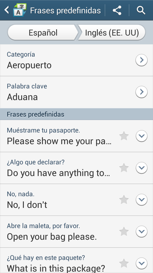 Otro aspecto interesante es que posee una base de datos de frases ya hechas organizadas por categorías (comida, compras, cultura, deportes, emergencias, emociones, hospital, hoteles, indicaciones, negocios saludos, transporte, turismo, vida cotidiana, vida social, visitas e invitaciones) y, dentro de ellas, por palabra clave.