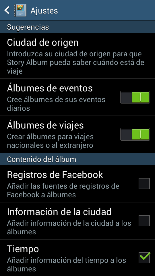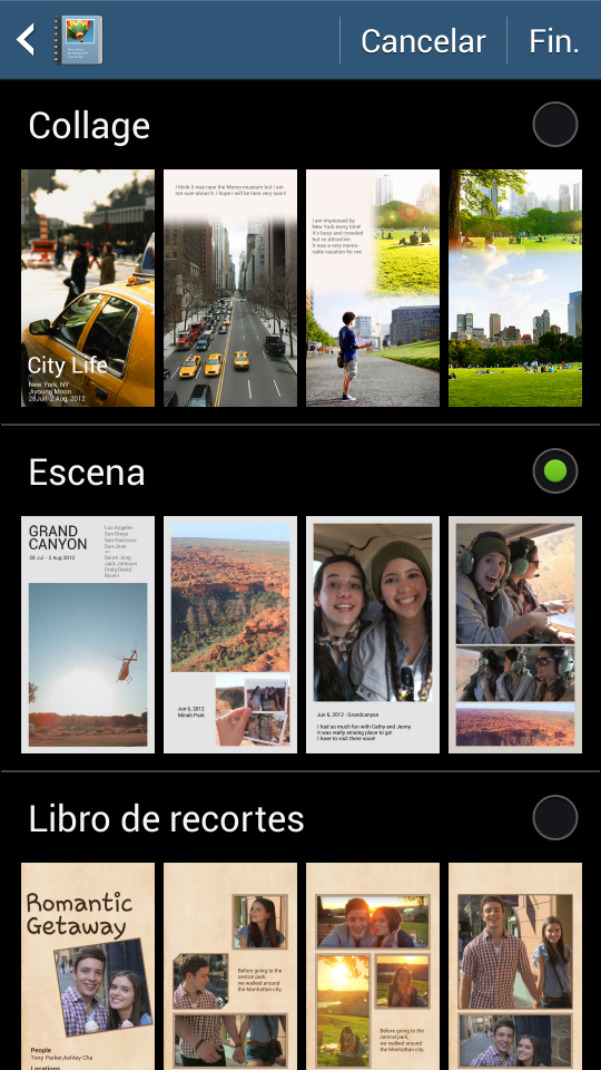 Story Album es una aplicación que permite crear álbumes de fotos a partir de las imágenes de la Galería. Posee varios modelos de álbum predefinidos (collage, escena, libro de recortes, cuadrícula, puzle y foto instantánea) que aplican diferentes efectos sobre las fotos. Una vez elegido el tema es posible editar cada página para recolocar la imagen y añadir texto, pero en general hay pocas opciones de edición.