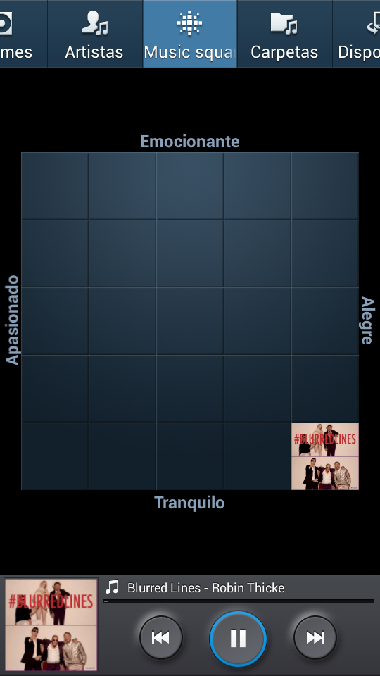 Music Square clasifica las canciones en un cuadrante en base a cuatro parámetros – emocionante, apasionado, alegre y tranquilo – y pulsando sobre un punto de ese cuadrante se reproducen las canciones de ese estilo.