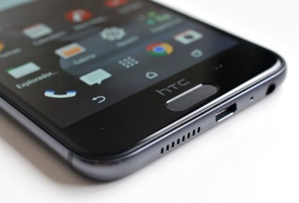 Debajo de la pantalla encontramos el logotipo de HTC en el marco que rodea la pantalla, y debajo de este podemos ver el lector de huella dactilar, que actúa también como botón físico de Inicio, con la salvedad de que no se aprieta sino que funciona por contacto.