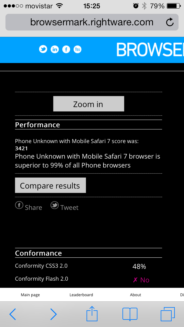 En el benchmark Browsermark el iPhone 5s obtiene 3.421 puntos, de nuevo una puntuación record por encima de los teléfonos Android más potentes que hemos probado.