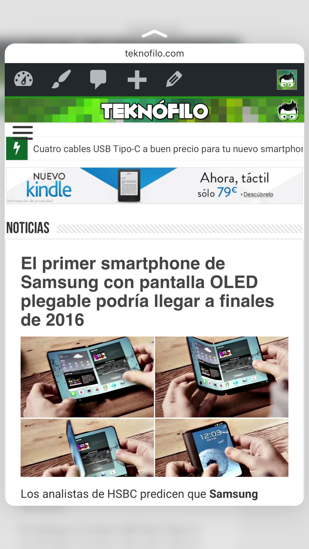 Pulsando el icono del libro abierto podemos ver los marcadores favoritos, la lista de lectura y los enlaces compartidos por nuestros contactos de Twitter. Esto último no me ha parecido demasiado útil ya que prefiero utilizar un cliente de Twitter específico.
