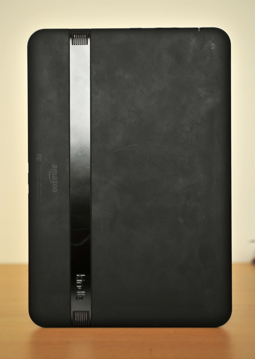 La parte trasera del Kindle Fire HD, sin embargo, sí que muestra el logotipo de Amazon en un color gris apenas perceptible y la inscripción Kindle, así como un altavoz a cada lado.