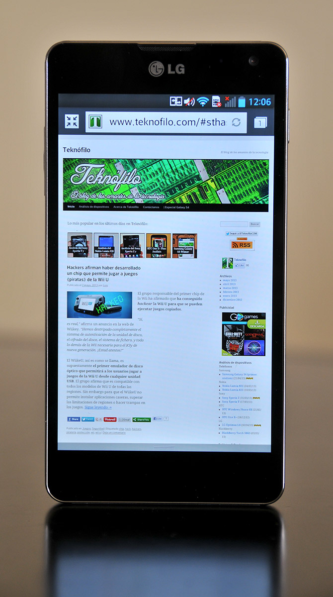 El ángulo de visión es excelente y el nivel de brillo que ofrece está por encima de la media de los teléfonos que hemos probado. Ahora bien, la pantalla produce algunos reflejos, por lo que resulta algo complicado utilizar la pantalla a plena luz del sol, si bien se compensa en parte gracias al elevado brillo de la pantalla. Por último, el LG Optimus G presenta unos colores vivos y fieles a la realidad, con unos negros profundos.