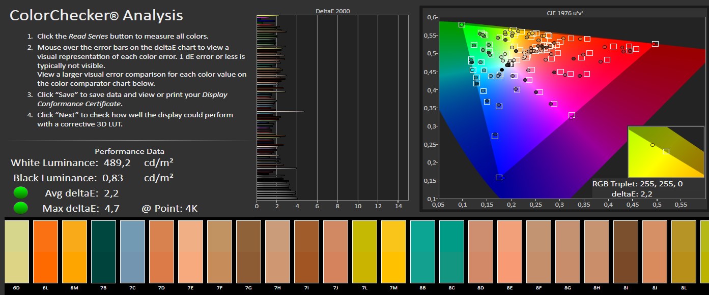 La fidelidad de los colores es muy alta, ya que el error medio resulta ser 2,2 dE (un valor por debajo de 3 dE se considera excelente y por encima de 9 se considera inaceptable), y el error máximo resulta ser de 4,7 dE, un valor bastante bajo.