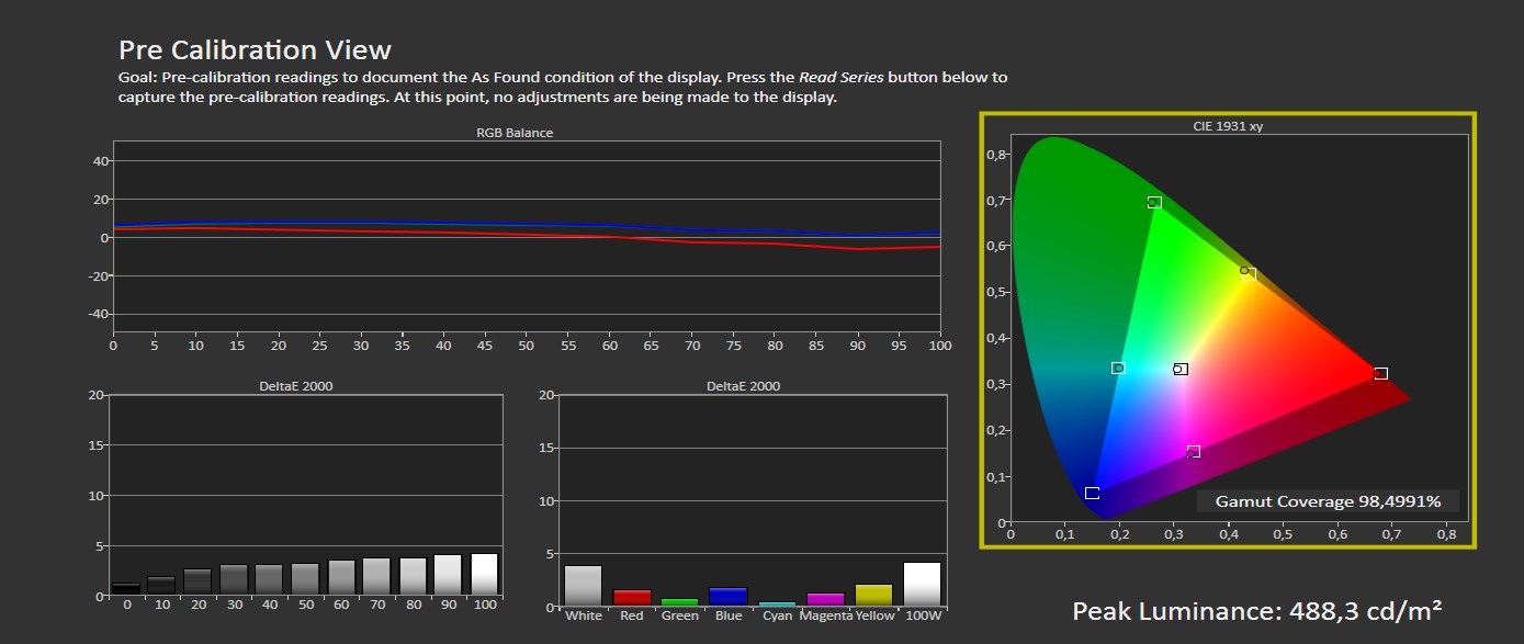 Para analizar la calidad de la pantalla hemos realizado diversas pruebas con el software profesional CalMAN Ultimate y un colorímetro X-Rite i1Display Pro.