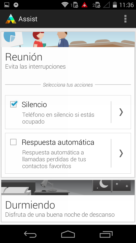 Motorola Assist permite silenciar el teléfono durante reuniones, permitiendo incluso acceder a las entradas del calendario de Google para detectar reuniones. También permite silenciar el teléfono durante los períodos de sueño, para lo cual permite establecer un horario de silencio. Ofrece algunas opciones interesantes como permitir las llamadas de usuarios favoritos o de personas que llamen dos veces en menos de cinco minutos.