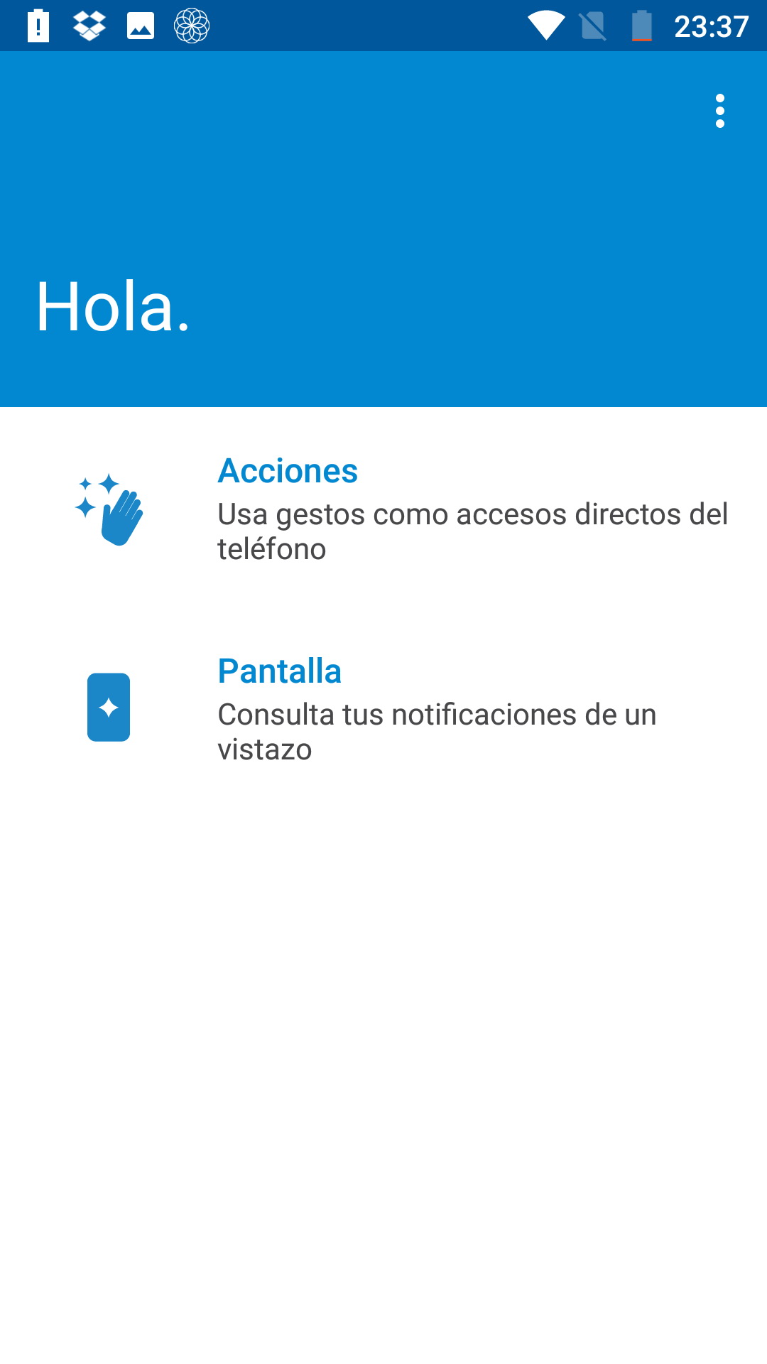 Pantalla consiste en que la pantalla se enciende automáticamente para mostrar las notificaciones cuando llegan. A diferencia del Moto Z, la pantalla no se enciende cuando detecta movimiento ni tampoco cuando pasas la mano por encima, ya que carece del hardware necesario para ello.