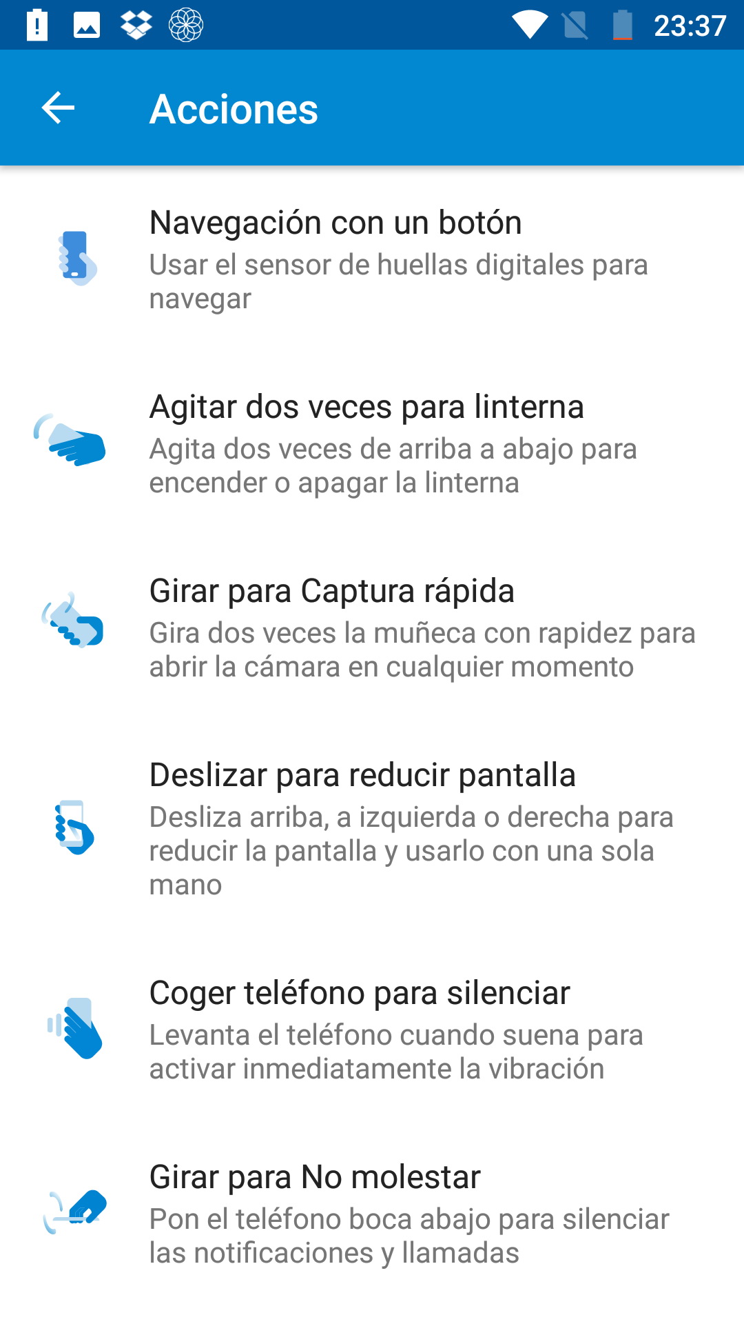 Otra funcionalidad es Acciones, que permite realizar diversas acciones mediante gestos: