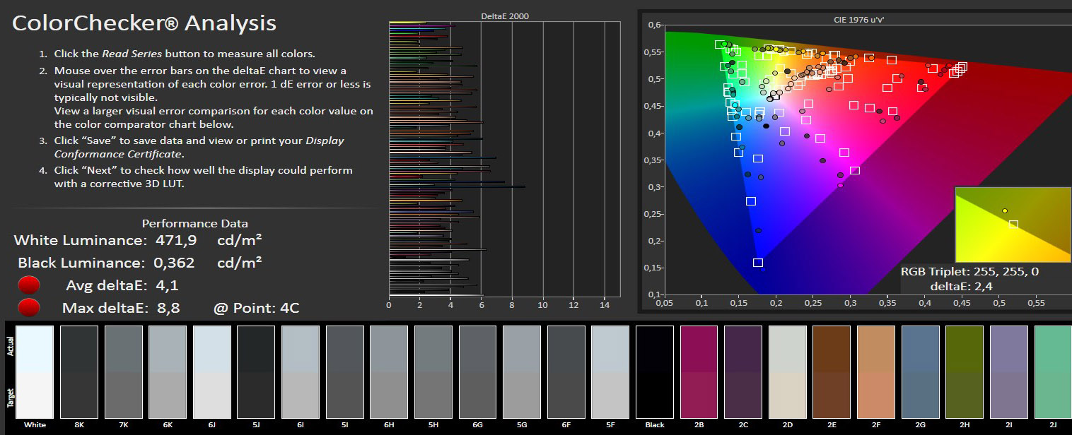 El error medio en la fidelidad de color resulta ser bastante bueno, 4.1 dE (un valor por debajo de 4 dE se considera excelente y por encima de 9 se considera inaceptable), y el error máximo resulta ser de 8.8 dE, un valor también aceptable. En el modo estándar, estos valores son todavía mejores ya que el error medio resulta ser 3.6 dE y el error máximo es 6.3 dE.