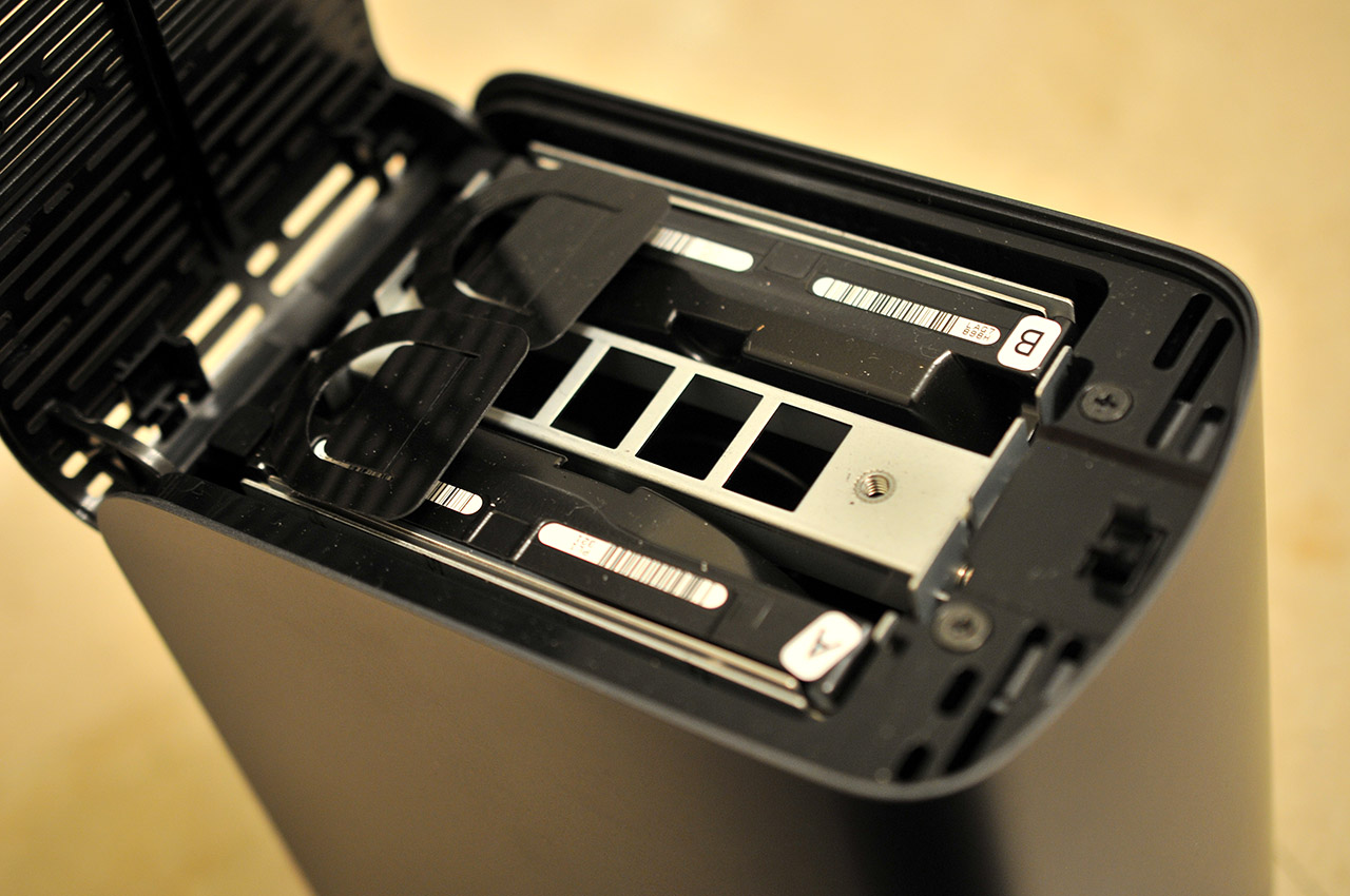 Para acceder a las unidades de disco internas debemos presionar ligeramente una pestaña que abre la tapa superior. De esta forma quedan al descubierto las dos unidades de disco, que pueden extraerse fácilmente estirando de una lengüeta de plástico tras desatornillar con los dedos un tornillo que fija una cubierta metálica . Las unidades están etiquetadas como A y B para identificar fácilmente qué unidad ha fallado y reemplazar la correcta.