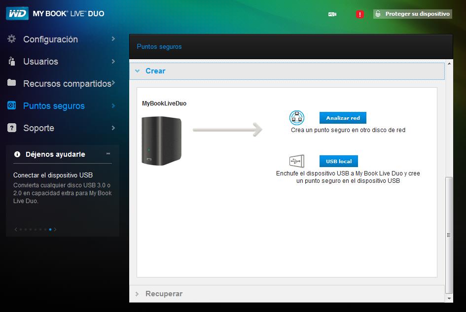En el menú Punto Seguro podemos crear y administrar puntos seguros. Un punto seguro es una imagen del My Book Live Duo en un momento del tiempo en otro dispositivo conectado a la red o mediante USB.