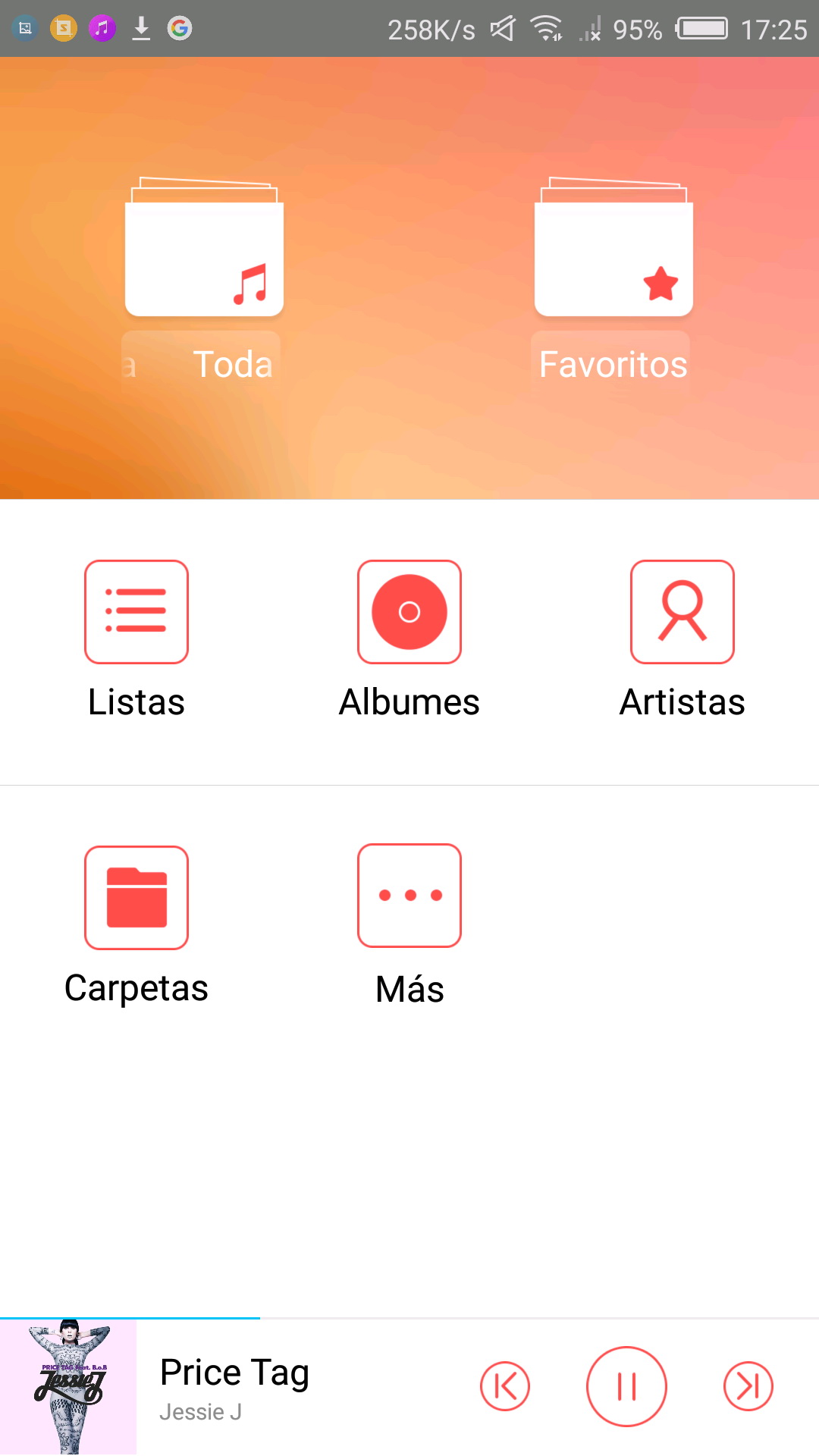 Las canciones aparecen organizadas por álbumes, artistas o carpetas, y también podemos crear listas de reproducción y añadir algunas pistas como favoritas.