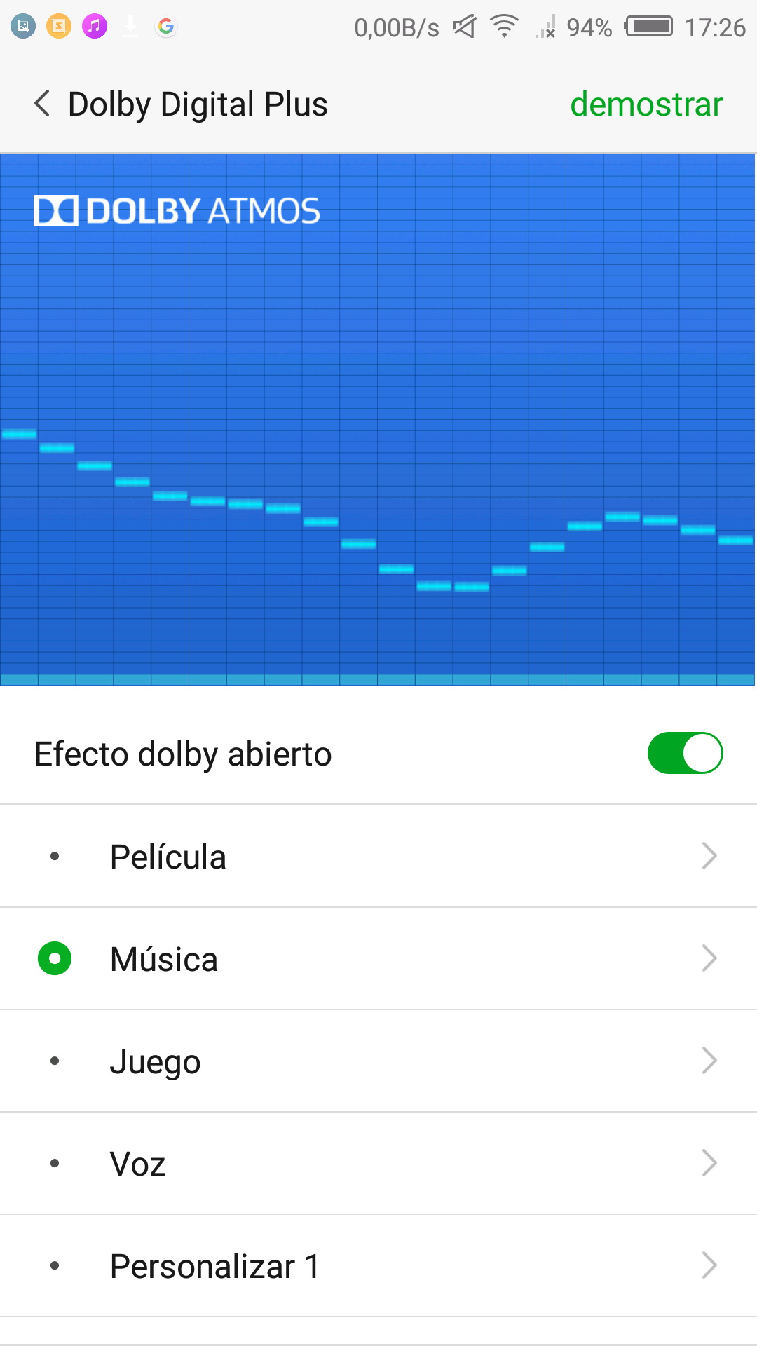 Nubia ha integrado las mejoras de Dolby Atmos en la propia aplicación, siendo posible seleccionar un perfil predefinido (película, música, juego o voz) o bien crear uno personalizado.