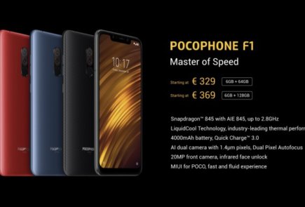 El Pocophone F1 posee una pantalla IPS LCD de 6.2″ con resolución Full HD+, procesador Snapdragon 845, 6GB de RAM, 64 o 128GB de almacenamiento, cámara trasera 12MP+5MP, cámara frontal de 20MP y batería de 4.000 mAh.
