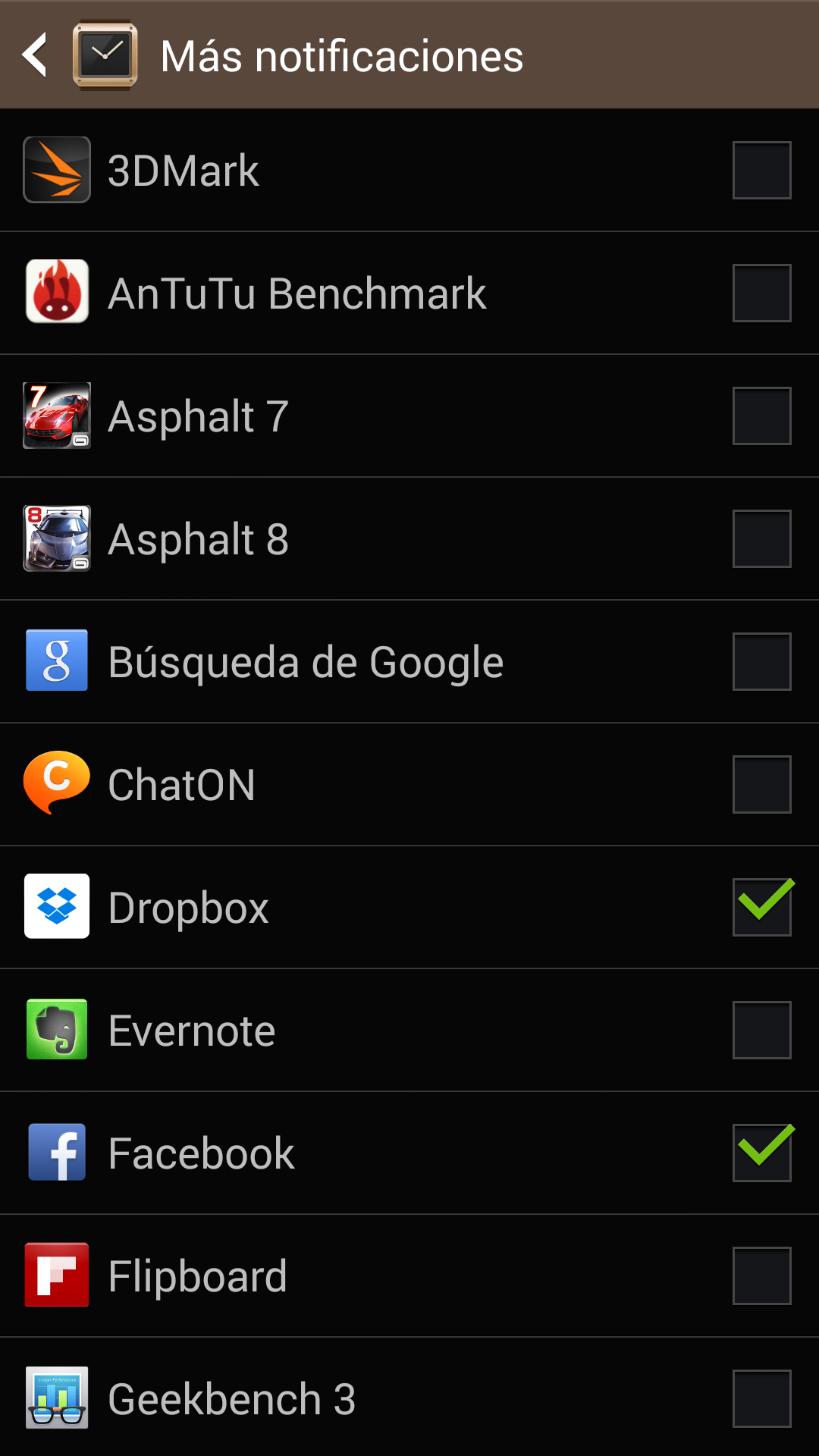 Además en la ultima actualización de software Samsung ha dado cabida a mostrar en el reloj notificaciones de cualquier otra aplicación que las muestre en el teléfono, de forma que ahora podemos añadir Facebook, Whatsapp, GMail, Twitter, Dropbox, Tapatalk, etc.