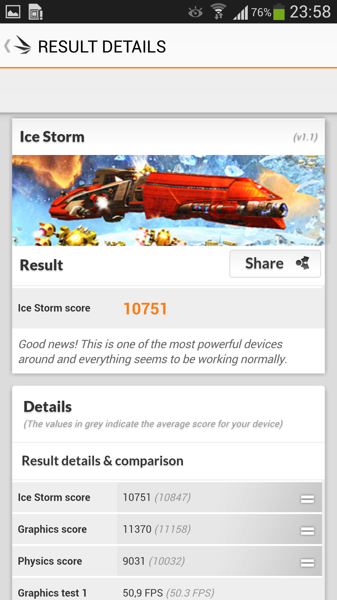 El test 3DMark centrado en las capacidades gráficas del teléfono tampoco ha decepcionado en absoluto, sino que su puntuación de 10.751 puntos en el test Ice Storm lo sitúa entre los mejores del momento, solo algo por debajo del HTC One con 11.311 puntos.