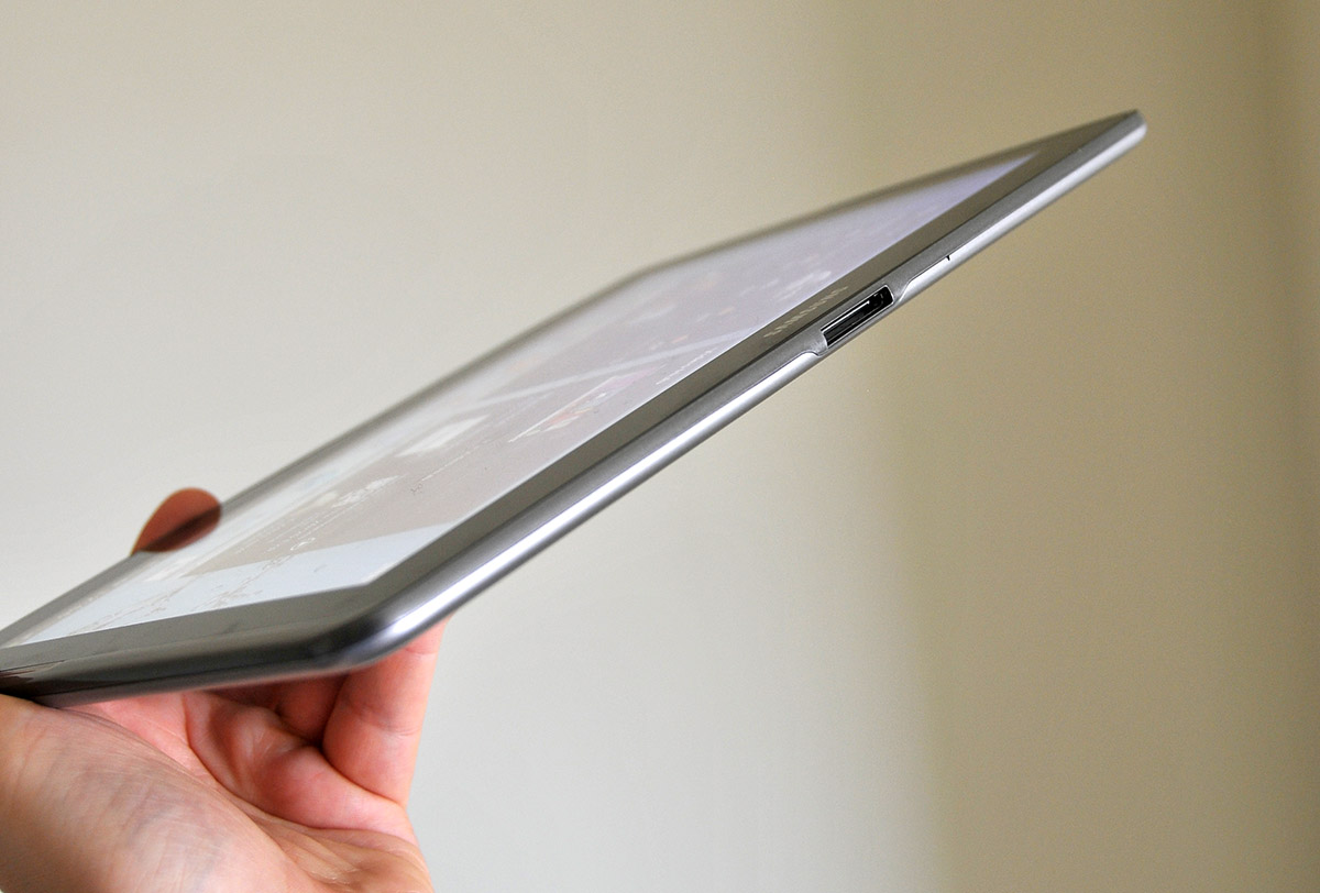 La tableta cuenta con una pantalla que mide 25,6 centímetros de diagonal (10,1 pulgadas). Alrededor de la pantalla, hay un marco de color negro y rodeando a ambos una carcasa de color gris plata (Titanio lo llaman).