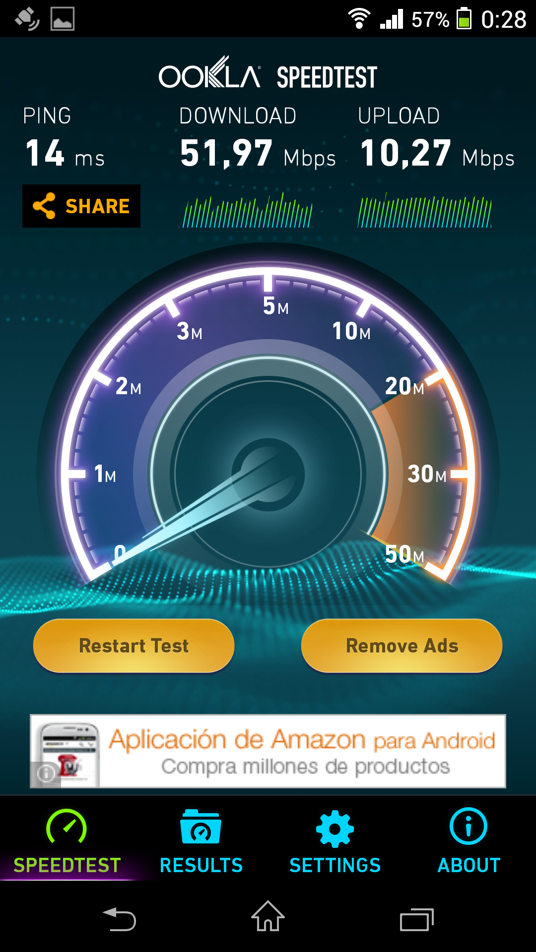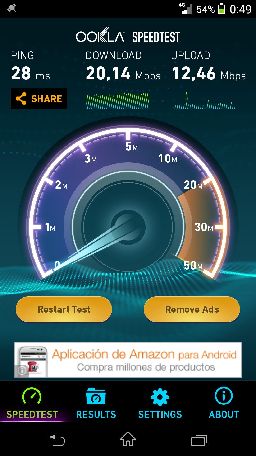 Se alcanzaron 52 Mbps de bajada y 10,3 Mbps de subida en Wi-Fi con una conexión de cable 100/10 de ONO, y 20,1Mbps de bajada y 12,5 Mbps de subida con una conexión 4G de Vodafone.