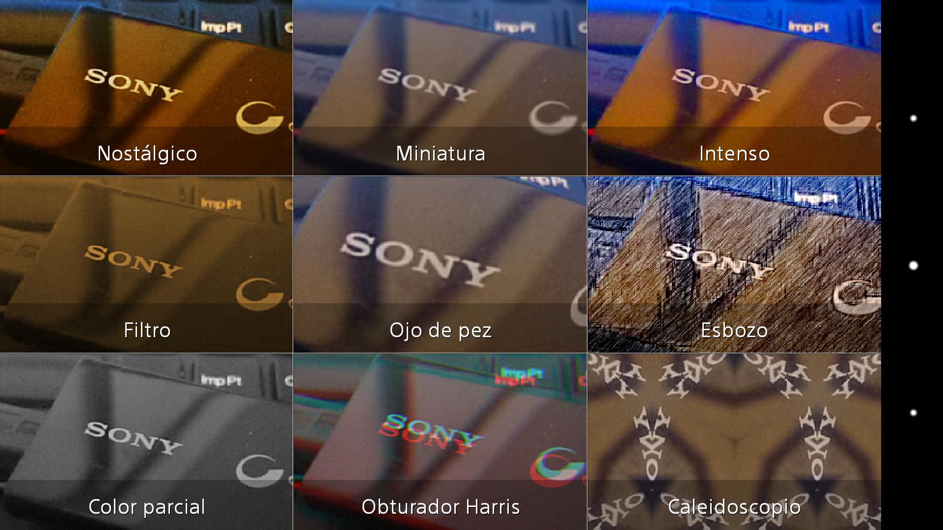 El modo de efecto de imagen permite escoger entre nueve efectos – nostálgico, miniatura, intenso, filtro, ojo de pez, esbozo, color parcial, obturador Harris y caleidoscopio – que se aplican y muestran en la pantalla en tiempo real sobre la imagen que captura la cámara.