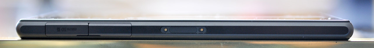 El lateral izquierdo está ocupado por los compartimentos de la ranura micro-SD y el conector micro-USB y, en el centro, por unos contactos metálicos para accesorios, por ejemplo bases de carga por contacto.