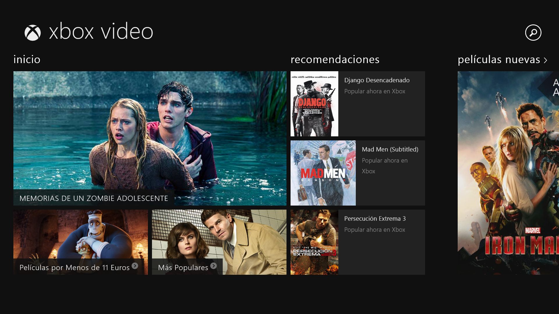 Además de reproducir ficheros locales Xbox Video ofrece, como comentábamos anteriormente, la reproducción de contenidos de vídeo a través de Internet. Un estreno como Iron Man 3 puede comprarse en HD por 18 € y en SD or 15 €, y alquilarse en HD por 5 € y en SD por 4 €. Una temporada completa de una serie como Modern Family cuesta 36 € en HD y 31 € en SD.